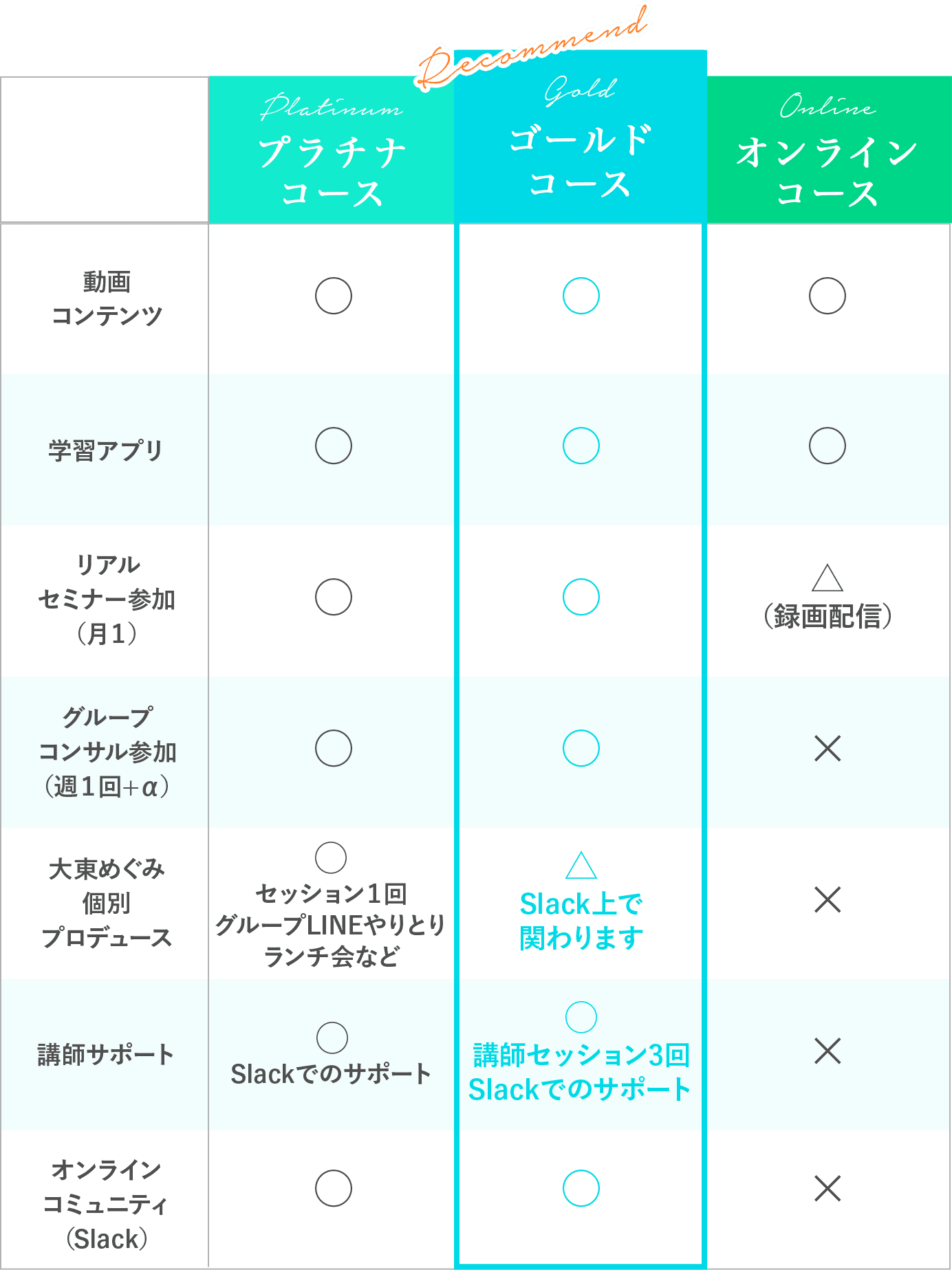 - A多くの人が結果を出してきた本質的で再現性のあるセオリーをお伝えしていきますが、「実践」をしないともちろん結果は出せません。具体的には講座に参加したり、ビデオを見たり、そして「実際にやってみる」ことです。そこで出てくる課題に取り組んでいくことです。